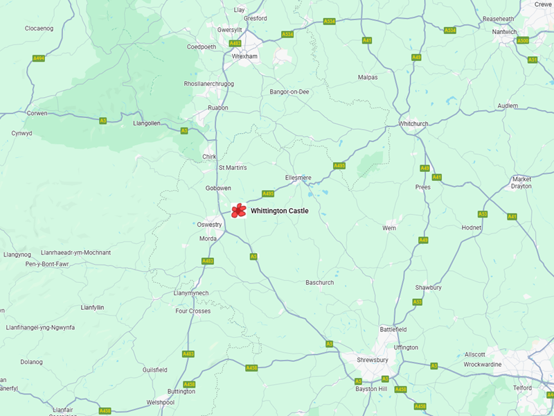 By Car Whittington Castle is situated in the centre of Whittington village. 2 miles east of Oswestry. It is just 20 minutes from Shrewsbury (A5), and 35 minutes from Chester (A483). When approaching Oswestry stay on the A483 or A5 and do not turn for Oswestry Town. Take the A495 signposted for Ellesmere off the Oswestry bypass and continue into Whittington over the railway level crossing. At the T-junction turn left staying on the A495. The castle is on your left and the car park entrance is just opposite the church on your left.